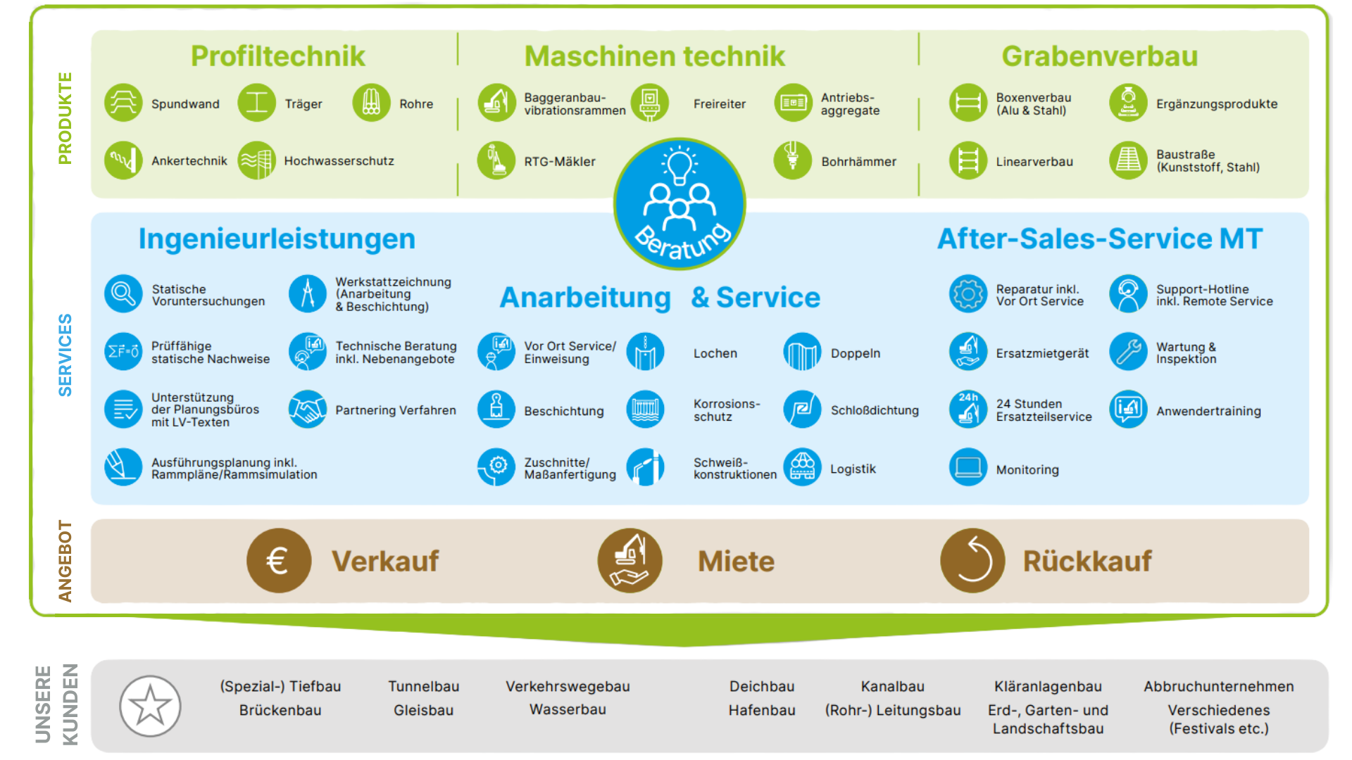Unsere Produkte kommen zum großen Teil aus eigener Produktion, wie zum Beispiel MÜLLER Ramm- und Ziehtechnik oder terra Kaltprofile. terra ASF Ankertechnik und Grabenverbausysteme von E+S sowie KRINGS werden exklusiv von uns vertrieben.